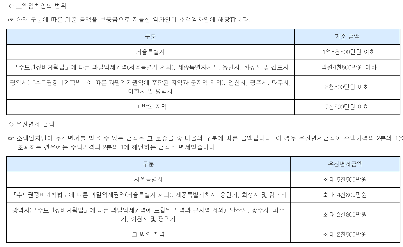 임차인의 대항력 요건인 전입일자와 확정일자와 상관없이 법에서 정한 소액보증금에 대해서는 임차인이 최우선적으로 배당받을 수 있는 권리를 말한다. 소액임차인의 최우선 변제권을 인정받기 위해서는 경매기입등기 이전에 부동산의 인도와 전입신고를 갖추어야 하는데 이때 확정일자는 갖추지 않아도 인정된다. 그리고 보증금의 액수가 주택 임대차 보호법에서 정한 '소액보증금의 범위'에 해당당해야 하며, 배당요구 종기일 이내에 베당요구를 하고, 종기일까지 대항력 요건을 유지해야 한다.