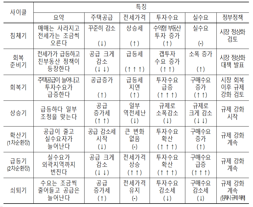 우리가 알고 있는 수많은 지식을 부정하지는 않는다. 기존의 부동산 투자공식을 따른다고 손해를 보는 것은 아니다. 다만, 원래 얻을 수 있는 수익보다는 적게 얻을 수밖에 없다는 것이다. 따라서 부동산을 투자할 때는 사람들의 생각이나 행동이 변화하는 때에 맞춰 거기에 맞는 투자전략을 세워야 한다는 것이다. 이것이 바로 저자 다년간의 현장경험에서 깨달은 부동산 가격의 사이클 변화에 맞춘 투자 원칙이다. 부동산 총 7단계의 흐름을 거친다. 저자가 제시하는 7단계의 사이클은 기존의 4단계를 더 세분화해서 정교하게 다듬은 사이클로서 해당 시기별로 어떠한 특징이 있는지 설명함으로써 부동산에 대한 투자시기가 다른 독자들이 투자시점에 어떠한 사이클에 있는지 쉽게 이해할 수 있도록 상세히 설명하고 있다. 이를 한 장의 표로 요약한다면 다음의 그림과 같다.
